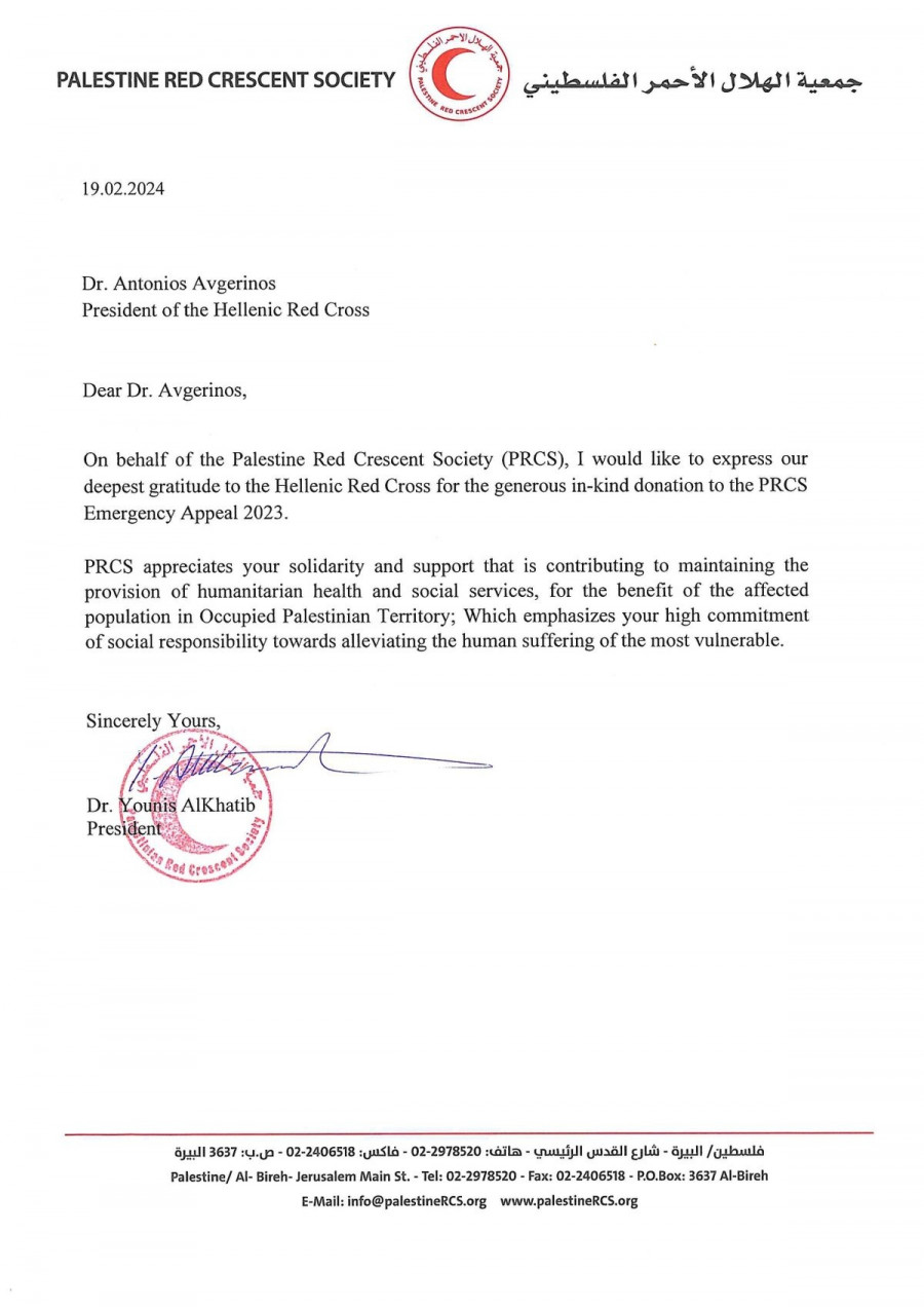 Ο Πρόεδρος της Παλαιστινιακής Ερυθράς Ημισελήνου Dr. Younis ALKhatib, απέστειλε ευχαριστήρια επιστολή στον Πρόεδρο του Ελληνικού Ερυθρού Σταυρού (Ε.Ε.Σ.), Dr. Αντώνιο Αυγερινό, για την μεγάλη ανθρωπιστική βοήθεια που απέστειλε ο Οργανισμός προς ενίσχυση των δοκιμαζόμενων συνανθρώπων μας από τις καταστροφικές συνέπειες των εχθροπραξιών που μαίνονται στην περιοχή.