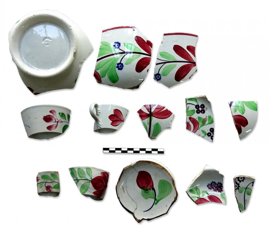 Τα είδη και ο διάκοσμος των κεραμικών σκευών παρουσιάζει αξιοσημείωτη ποικιλία. Μεγάλος αριθμός θραυσμάτων ανήκει σε σκεύη αγγλικών εργαστηρίων των περιοχών Staffordshire και Swansea και αποτελούν χαρακτηριστικά δείγματα δύο βασικών τεχνικών της διακόσμησης “transfer ware”, γνωστών ως China Βlue και Flow Blue. Ως προς το θέμα του διακόσμου κυριαρχούν τα «Willow» και ο «Wild Rose Nuneham Courtnay», ενώ περιορισμένος αριθμός πιάτων φέρουν παραστάσεις όπως η «Δαμασκός», η «Λαχώρη», ο «Βόσπορος» κ.ά. Θραύσματα τεσσάρων πιάτων εικονίζουν το βασιλικό ζεύγος της Σουηδίας, Όσκαρ και Ζοζεφίνα· επετειακό θέμα που κυκλοφόρησε με αφορμή της ανάρρησής τους στον θρόνο το 1844. Αγγλικής προέλευσης είναι και σκεύη με ανθικό διάκοσμο κατασκευασμένο με την τεχνική του σπόγγου (spongeware). Στην κατηγορία «Μocha» ανήκουν κούπες και ίσως κανάτες με χαρακτηριστικό διάκοσμο από επάλληλες ταινίες γαλάζιου, μπλε και πράσινου και το σχέδιο της σκακιέρας που διακρίνονται για το ιδιαίτερα στιλπνό υάλωμα και χρονολογούνται στα τέλη του 19ου αι., όπως και θραύσματα από σετ πρωινού, τα οποία προορίζονταν κυρίως για τις αγορές των μεγάλων πόλεων της Τουρκίας στα Βαλκάνια και στην Ανατολή.
