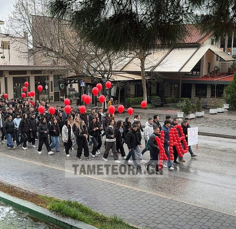 Όπως κατέγραψε η ιστοσελίδα tameteora.gr μαθητές που συμμετείχαν στη συγκέντρωση και στην πορεία για τα τρία κορίτσια από το Καστράκι Καλαμπάκας, τη Χρύσα, τη Θώμη και την Αναστασία, καθώς και για όλα τα θύματα των Τεμπών, άφησαν να ανέβουν στον ουρανό πάνω από τον σταθμό των τρένων κόκκινα μπαλόνια σε μια συμβολική κίνηση.