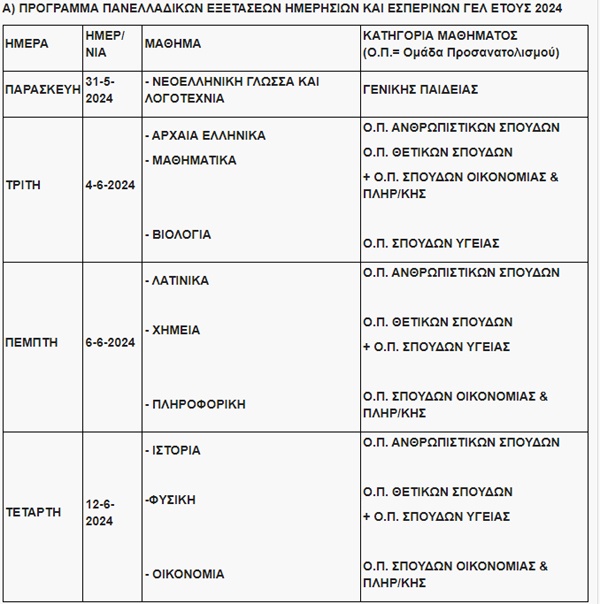 Από το Υπουργείο Παιδείας, Θρησκευμάτων και Αθλητισμού ανακοινώνεται το πλήρες πρόγραμμα των πανελλαδικών εξετάσεων έτους 2024, όπως αναφέρουν τα foititikanea.gr