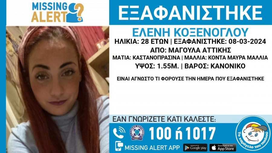 Συναγερμός έχει σημάνει στο «Χαμόγελο του Παιδιού» για την εξαφάνιση της Κοξένογλου Ελένης. Η 28χρονη εξαφανίστηκε στις 08 Μαρτίου 2024, από τη Μαγούλα Αττικής. «Το Χαμόγελο του Παιδιού» ενημερώθηκε για την εξαφάνιση της Κοξένογλου Ελένης, σήμερα, 10 Μαρτίου 2024 και προχώρησε άμεσα, κατόπιν αιτήματος της οικογένειάς της, στη δημοσιοποίηση των στοιχείων της ενήλικης, καθώς ενδέχεται να συντρέχουν λόγοι, οι οποίοι θέτουν τη ζωή της σε κίνδυνο.