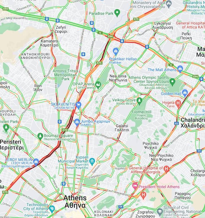 Πιο συγκεκριμένα, στο έντονο «κόκκινο» βρίσκεται η λεωφόρος Κηφισού από το Αιγάλεω μέχρι και ο ύψος της Λυκόβρυσης, τόσο στην άνοδο όσο και στην κάθοδο.