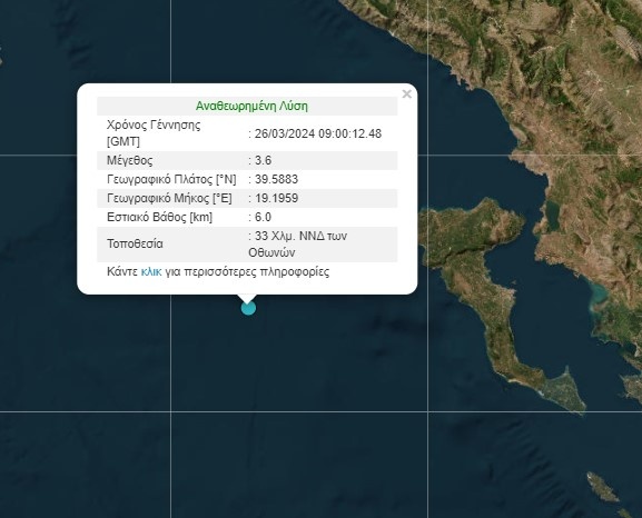 Σεισμική δόνηση σημειώθηκε το πρωί της Τρίτης 26 Μαρτίου στην Κέρκυρα.