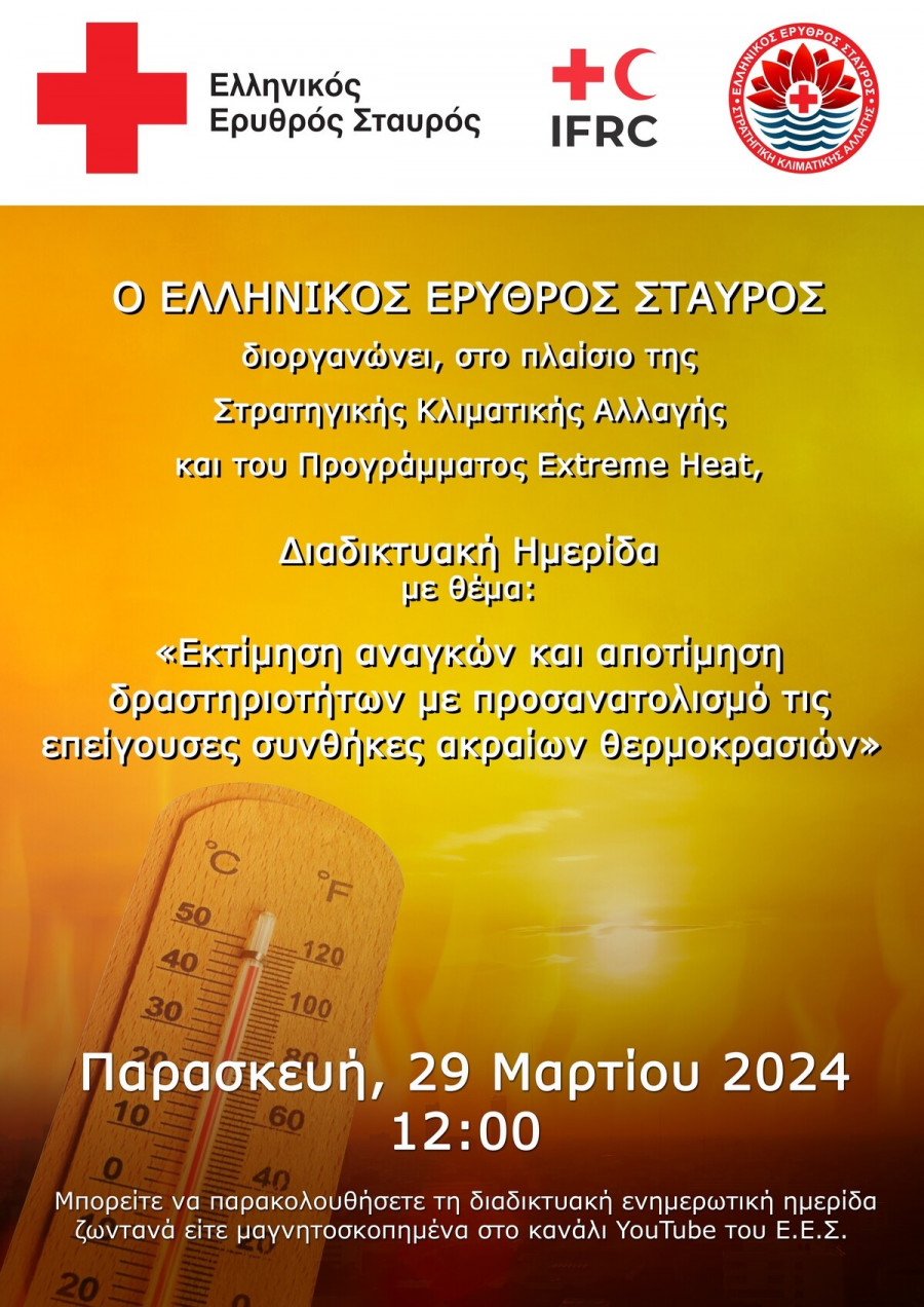 Ο Ελληνικός Ερυθρός Σταυρός, την Παρασκευή 29 Μαρτίου 2024 και ώρα 12.00 μ.μ. θα πραγματοποιήσει διαδικτυακή εκπαιδευτική – ενημερωτική ημερίδα με θέμα : «Εκτίμηση και αποτίμηση δραστηριοτήτων με προσανατολισμό στις επείγουσες συνθήκες ακραίων θερμοκρασιών».