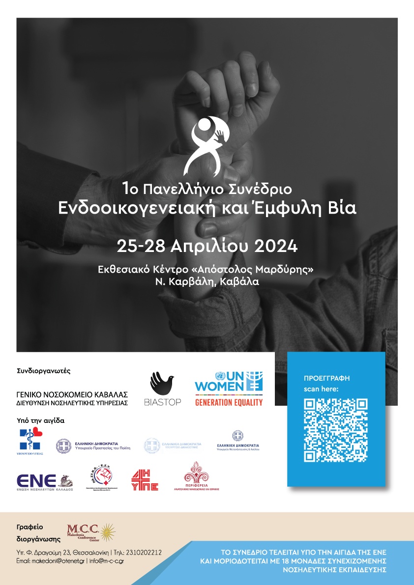 Το 1οΠανελλήνιο Συνέδριο με θέμα «Ενδοοικογενειακή και Έμφυλη Βία» θα πραγματοποιηθεί από τις 25 έως τις 28 Απριλίου 2024, στο Εκθεσιακό Κέντρο «Απόστολος Μαρδύρης» στη Ν. Καρβάλη στην Καβάλα. Ο φορέας του ΟΗΕ για την Ισότητα των Φύλων και την Ενδυνάμωση της Θέσης της Γυναίκας (UN Women), η Διεύθυνση και το Γραφείο Εκπαίδευσης της Νοσηλευτικής Υπηρεσίας του Γενικού Νοσοκομείου Καβάλας στην Υγειονομική Περιφέρεια Ανατολικής Μακεδονίας-Θράκης και το Ινστιτούτο Πρόληψης και Θεραπείας της Βίας και Προώθησης της Ισότητας των Φύλων "ΒΙΑ-ΣΤΟΠ" ενώνουν τις δυνάμεις τους σε μια επιστημονική και ολιστική προσέγγιση του ζητήματος της ενδοοικογενειακής και έμφυλης βίας.