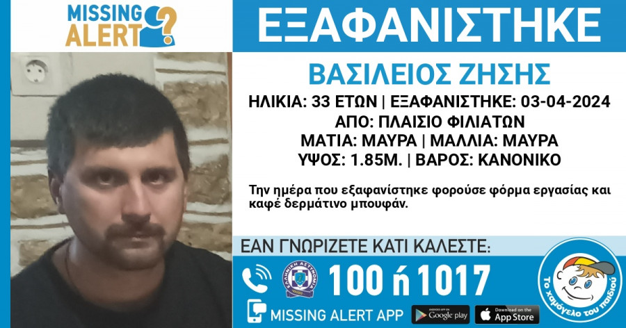 Στις 3/4/2024, απογευματινές ώρες, εξαφανίστηκε από το χωριό Πλαίσιο Φιλιατών, ο Ζήσης (επ.) Βασίλειος (ον.), 33 ετών. Το «Χαμόγελο του Παιδιού» ενημερώθηκε για την εξαφάνιση του Ζήση Βασιλείου σήμερα και προχώρησε στη δημοσιοποίηση των στοιχείων του ενήλικου κατόπιν αιτήματος της οικογένειας του καθώς ενδέχεται να συντρέχουν λόγοι οι οποίοι θέτουν τη ζωή του σε κίνδυνο.