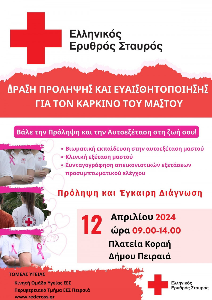 Ο Ελληνικός Ερυθρός Σταυρός, στο πλαίσιο της εκστρατείας για την Ενημέρωση & Ευαισθητοποίηση κατά του καρκίνου του μαστού προγραμματίζει δράση αφιερωμένη στην πρόληψη και στην πρώιμη ανίχνευση του γυναικείου καρκίνου, την Παρασκευή 12 Απριλίου 2024 και ώρα 09.00 – 14.00 στην Πλατεία Κοραή του Δήμου Πειραιά.