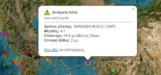 Υπενθυμίζεται, ο,τι η σεισμική δόνηση 4,4 Ρίχτερ σημειώθηκε 16.6 χιλιόμετρα Δυτικά - βορειοδυτικά της Σάμου. Σύμφωνα με το Γεωδυναμικό Ινστιτούτο, το επίκεντρο του σεισμού εντοπίστηκε χμ ΔΒΔ της Σάμου. Το εστιακό του βάθος υπολογίστηκε στα 2 χιλιόμετρα.