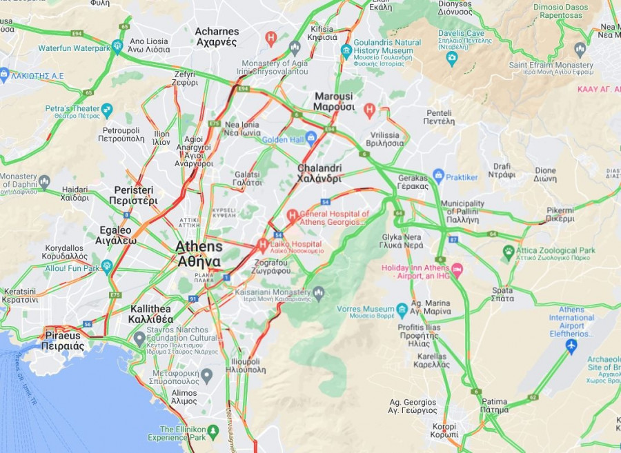 Δύσκολη είναι η κατάσταση και στην Κηφισίας αλλά και στην Μεσογείων ενώ αρκετά προβλήματα υπάρχουν στο ρεύμα προς το αεροδρόμιο αλλά και προς Μαρκόπουλο.