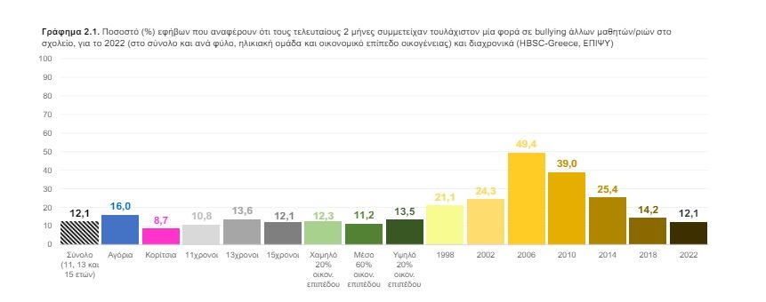Ένας στους 8 (12,1%) εφήβους στην Ελλάδα έχει πολύ πρόσφατα συμμετάσχει σε εκφοβισμό άλλου/ης μαθητή/ριας και σε ποσοστό 7,1% έχουν κάνει ηλεκτρονικό εκφοβισμό.