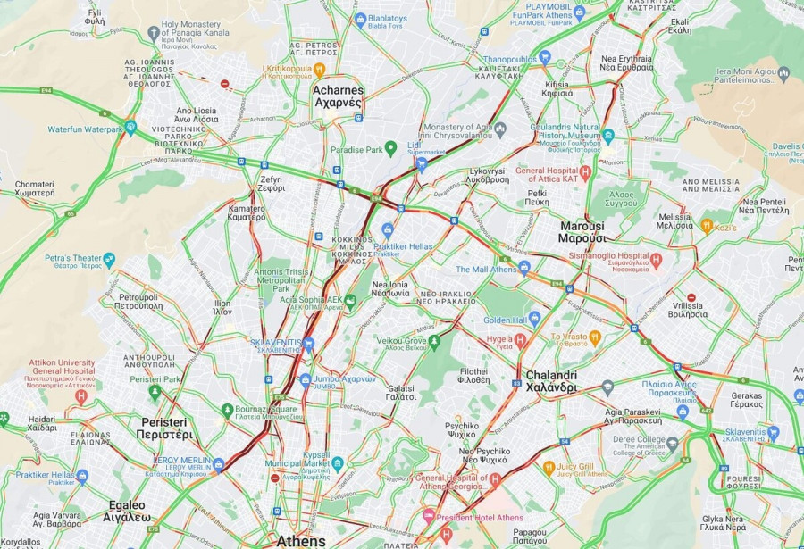 Πιο συγκεκριμένα, στο «κόκκινο» βρίσκεται η λεωφόρος Κηφισού τόσο στην άνοδο όσο και στην κάθοδο από το ύψος του Περιστερίου μέχρι και την Κηφισιά, ιδιαίτερα στο ύψος της Oδού Λένοραμν και ρεύμα κυκλοφορίας προς Πειραιά, καθώς σημειώθηκαν δυο τροχαία με μηχανές.