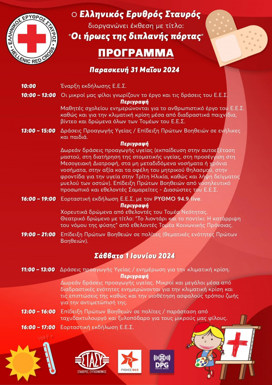 Κατά τη διάρκειά της, εθελοντές και προσωπικό του Ε.Ε.Σ. από όλους τους Τομείς (Υγείας, Κοινωνικής Πρόνοιας, Σαμαρειτών-Διασωστών, Ναυαγοσωστών & Νεότητας) θα ενημερώνουν τον κόσμο για το έργο και τις δράσεις του Ελληνικού Ερυθρού Σταυρού. Σημειώνεται ότι στον χώρο θα υπάρχει μεγάλη έκθεση εξοπλισμού του Ε.Ε.Σ., όπου το κοινό θα μπορεί να γνωρίσει από κοντά τους «Ήρωες της διπλανής πόρτας» και να ενημερωθεί αναλυτικά για το έργο τους. Παράλληλα, θα πραγματοποιηθούν δωρεάν δράσεις προαγωγής υγείας (εκπαίδευση στην αυτοεξέταση μαστού, διατήρηση της στοματικής υγείας, φροντίδα για την υγεία στην Τρίτη Ηλικία, λήψη δείγματος μυελού των οστών κ.α.) από το έμπειρο νοσηλευτικό προσωπικό του Ε.Ε.Σ. Τέλος, το Σάββατο (1/6) εθελοντές και προσωπικό του Ε.Ε.Σ. θα ενημερώνουν μικρούς και μεγάλους, με διαδραστικά παιχνίδια και δρώμενα, για την κλιματική κρίση και τις επιπτώσεις της, καθώς και την υιοθέτηση ασφαλούς τρόπου ζωής για την αντιμετώπισή της. Παράλληλα, ταχυδακτυλουργός και ξυλοπόδαρος θα προσφέρουν ευχάριστες στιγμές στους μικρούς μας φίλους.