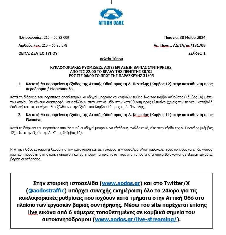 Αναλυτικότερα, κλειστή θα παραμείνει η έξοδος της Αττικής Οδού προς τη Λ. Πεντέλης (Κόμβος 12) στην κατεύθυνση προς Αεροδρόμιο / Μαρκόπουλο. Κατά τη διάρκεια του παραπάνω αποκλεισμού, οι οδηγοί μπορούν να κινηθούν ευθεία έως τον Κόμβο Ανθούσας (Κόμβος 14) μέσω του οποίου θα κάνουν αναστροφή, θα εισέλθουν στην Αττική Οδό στην κατεύθυνση προς Ελευσίνα (χωρίς την εκ νέου καταβολή διοδίων) και στη συνέχεια θα εξέλθουν στην έξοδο του Κόμβου 12 προς τη Λ. Πεντέλης.