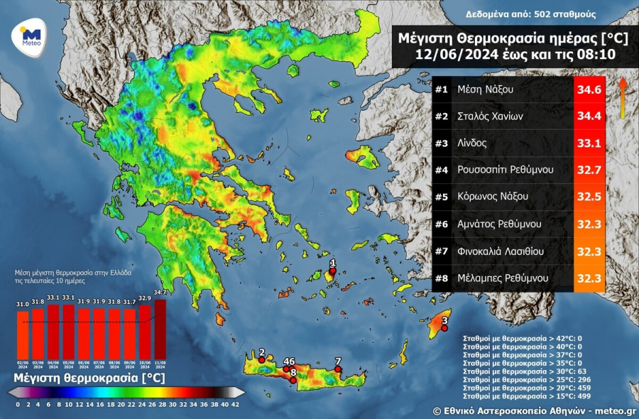 Πολύ υψηλές θερμοκρασίες καταγράφονται ήδη από το δίκτυο αυτόματων μετεωρολογικών σταθμών του meteo.gr/Εθνικού Αστεροσκοπείου Αθηνών το πρωί της Τετάρτης 12/06, ιδιαίτερα στις Κυκλάδες, στην Κρήτη και στα Δωδεκάνησα, όπου ο υδράργυρος τοπικά ξεπερνά τους 34 °C. Παράλληλα, 63 από τους 502 ενεργούς σταθμούς (την παρούσα χρονική στιγμή) καταγράφουν ήδη θερμοκρασίες άνω των 30 °C.