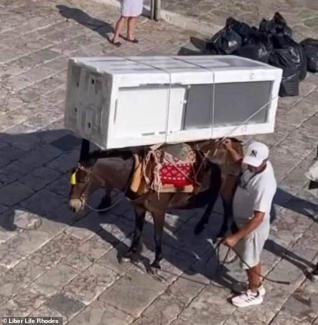 Άλλες εικόνες δείχνουν ένα ζώο να κουβαλάει βαριά ξύλα, ενώ ένας άλλος γάιδαρος φαίνεται να μεταφέρει ένα ψυγείο δεμένο στην πλάτη του.
