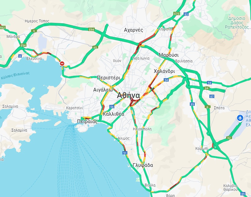 Πιο αναλυτικά, μποτιλιαρισμένη είναι η Εθνική οδός Αθηνών-Λαμίας στο ύψος της Αττικής οδού, σε τμήματα της λεωφόρου Αλεξάνδρας και της λεωφόρου Μεσογείων καθώς και στην άνοδο της λεωφόρου Κηφισίας αλλά και στην Κατεχάκη στο ρεύμα προς Ηλιούπολη στο ύψος της Καισαριανής.