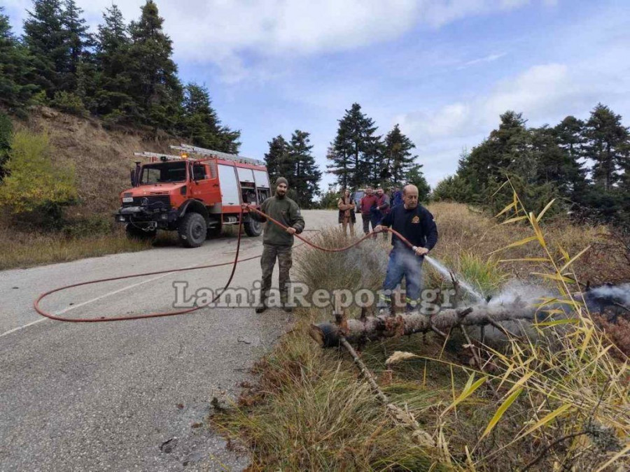 Σύμφωνα με πληροφορίες του lamiareport.gr ένα μεγάλο έλατο το οποίο φέρεται να προσπάθησαν να κόψουν λαθροϋλοτόμοι, έπεσε πάνω στη γραμμή μεταφοράς υψηλής τάσης, αρπάζοντας φωτιά, ενώ προκάλεσε και βλάβη στο δίκτυο.
