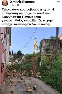 Κέρκυρα: Κατάρρευσε τοιχίο στον ναό του Αγίου Ιωάννη από έντονη βροχόπτωση