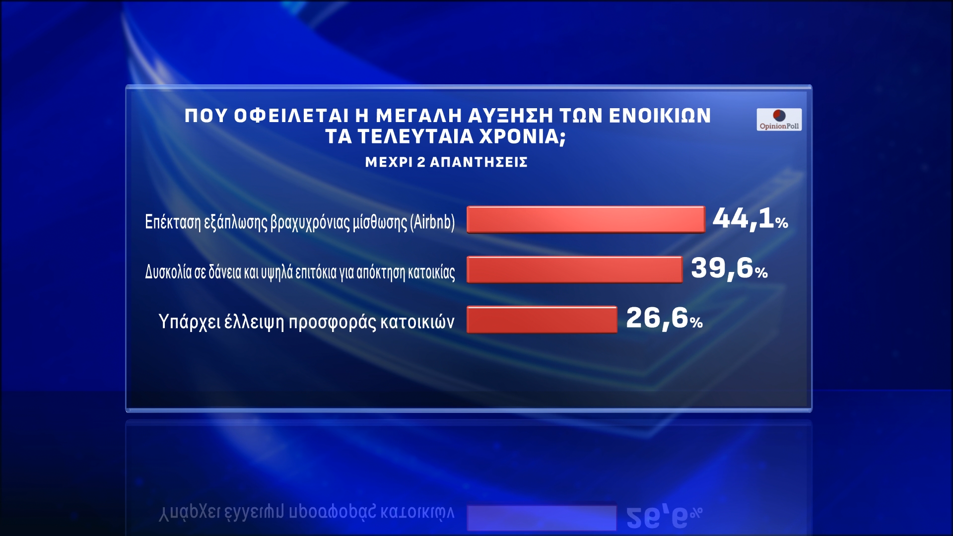 Το δεύτερο μέρος της δημοσκόπησης της Opinion Poll για λογαριασμό του τηλεοπτικού σταθμού Action 24 εστιάζει στα προβλήματα των πολιτών με τα ακίνητα στη χώρα. Οι ερωτηθέντες αξιολογούν τις πρωτοβουλίες της Κυβέρνησης για το πρόγραμμα «Σπίτι μου 2» και «Ανακαινίζω», ενώ απαντούν για τα αίτια της αύξησης των ενοικίων.