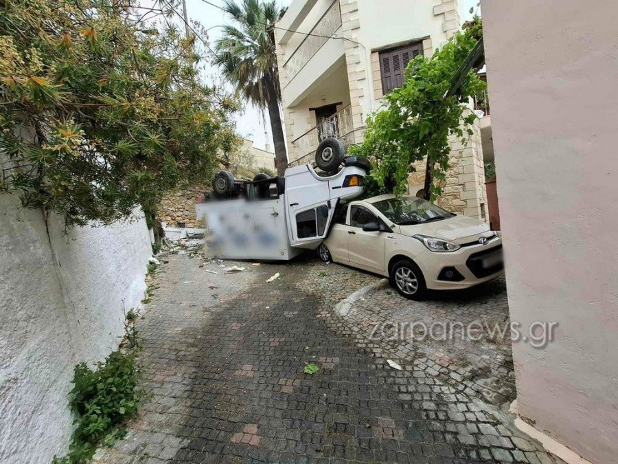 Χανιά: Φορτηγό ανετράπη και έπεσε πάνω σε σταθμευμένο όχημα - Εικόνες