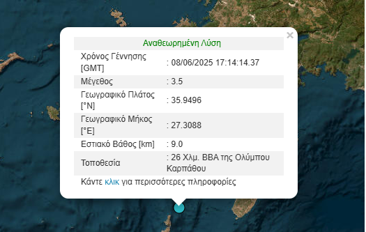 Σεισμός μεγέθους 3,5 της κλίμακας Ρίχτερ σημειώθηκε στη θαλάσσια περιοχή της Καρπάθου, νωρίς το βράδυ της Κυριακής (08/06).
