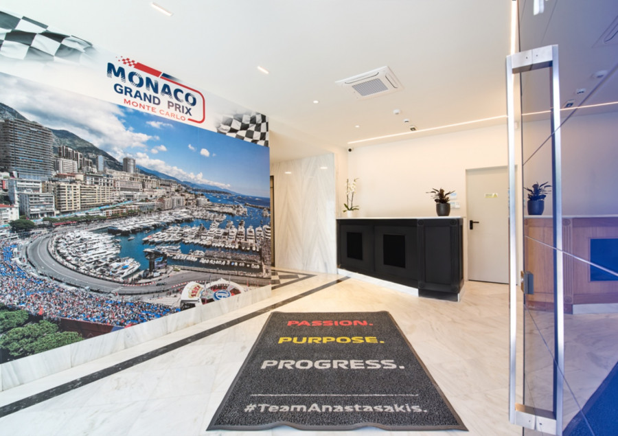 Η είσοδος της νέας κλινικής Anastasakis Hair Clinic στην Αθήνα. Ένα πραγματικό μονοθέσιο της Ferrari F1 (μοντέλο SF71H του 2018) δεσπόζει στο lobby, προϊδεάζοντας τους επισκέπτες για την κορυφαία εμπειρία που ακολουθεί.
