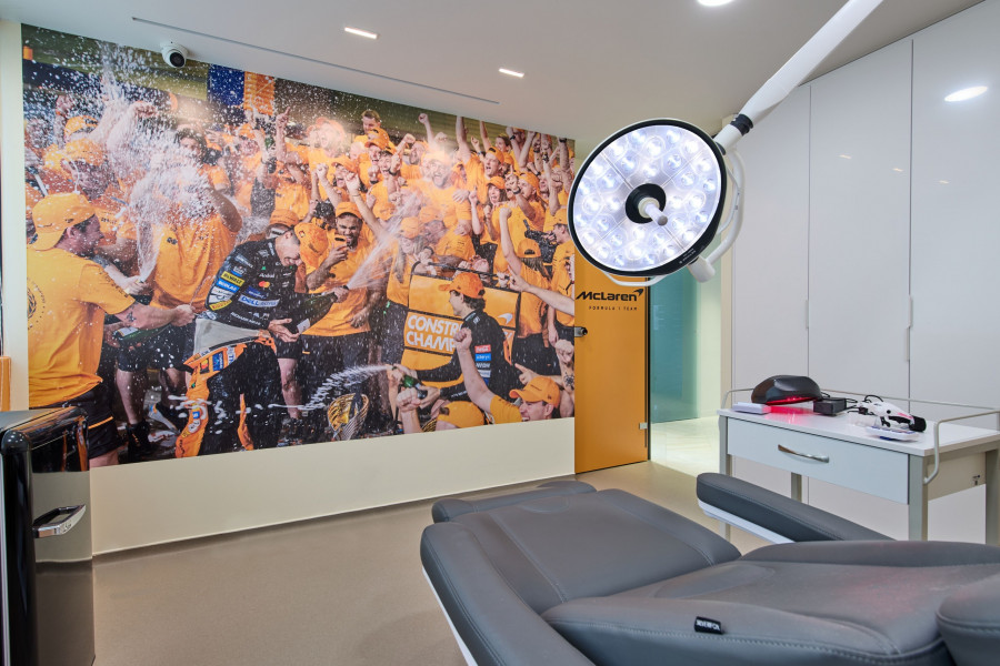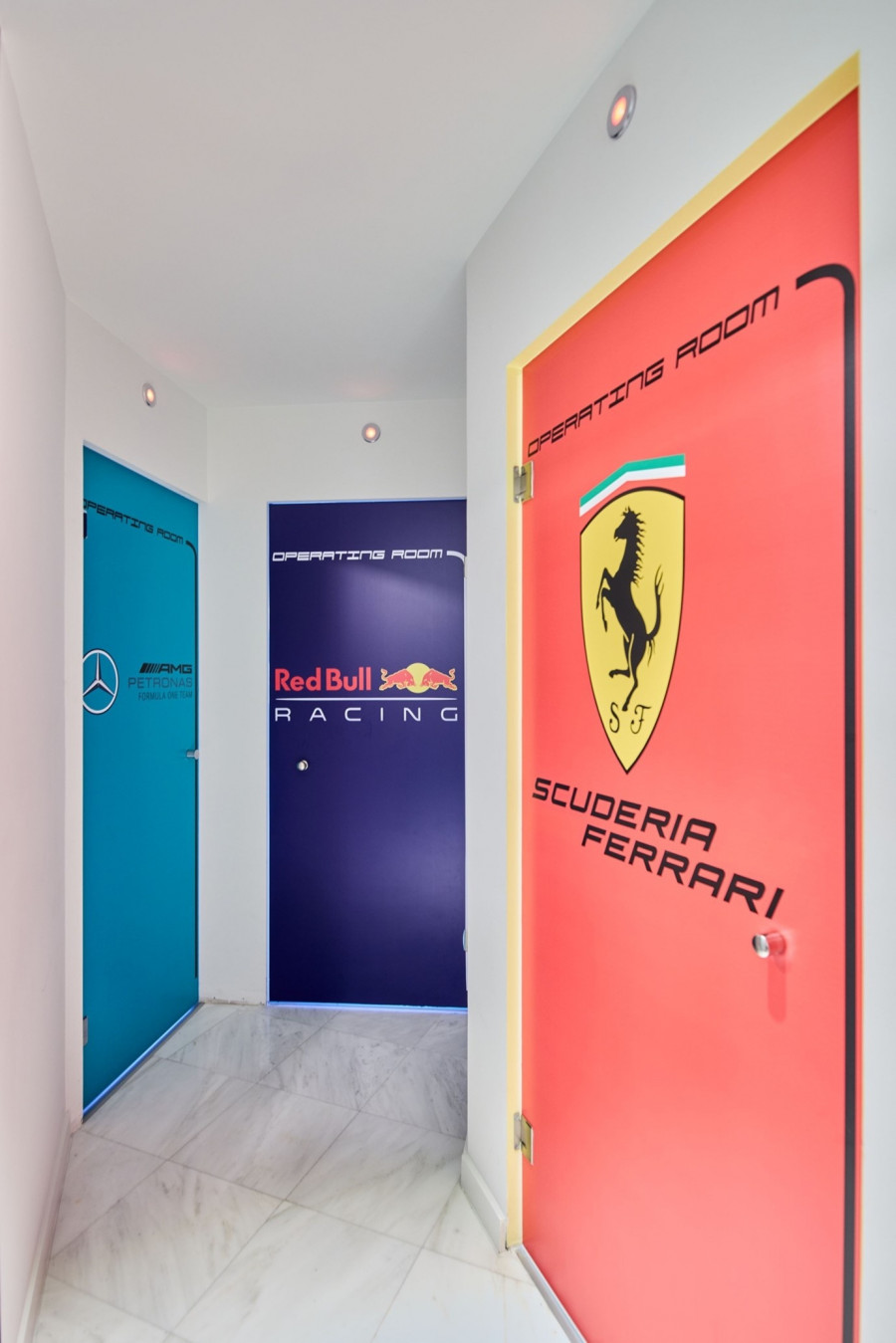 Το πιο εντυπωσιακό, όμως, είναι οι υπερσύγχρονες χειρουργικές αίθουσες που καταλαμβάνουν τον υπόλοιπο όροφο, διακοσμημένες σε αποχρώσεις της McLaren και της Aston Martin, με ειδικά wallpapers από σκηνές Formula 1 να καλύπτουν τους τοίχους. Κάθε επέμβαση εδώ θυμίζει έναν αγώνα F1: Μια συντονισμένη, ταχύτατη και ακριβής διαδικασία όπου η ομάδα λειτουργεί σαν καλοκουρδισμένη μηχανή.