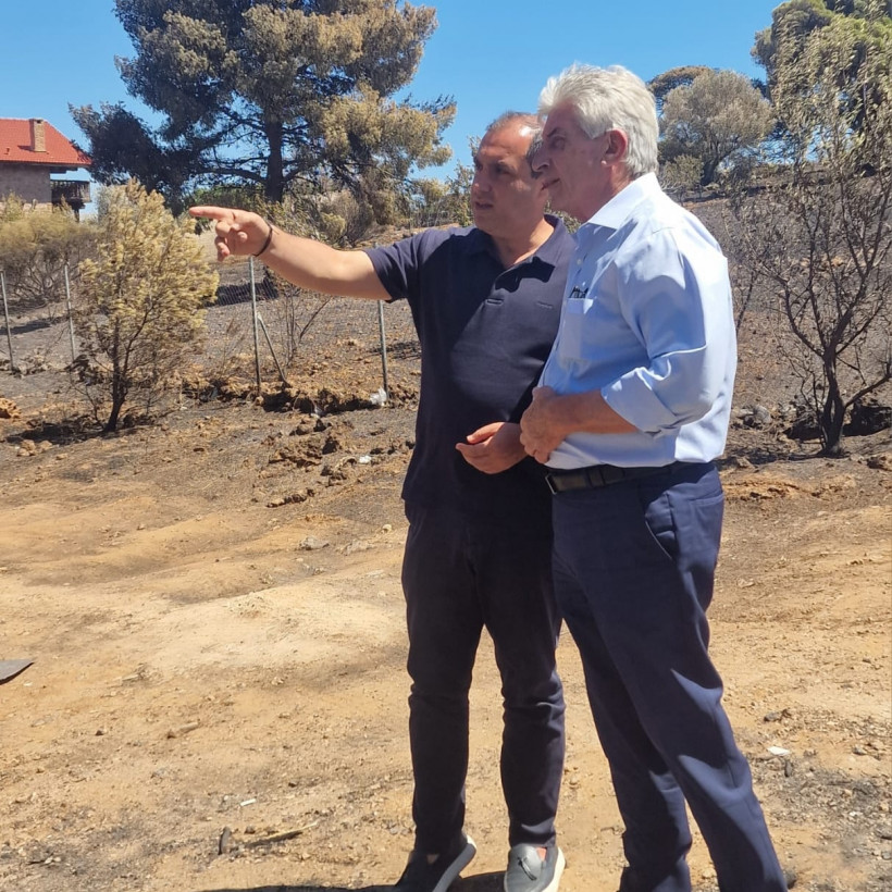 Ο Υφυπουργός Πολιτικής Προστασίας και Κλιματικής Κρίσης, αρμόδιος για την Αποκατάσταση από Φυσικές Καταστροφές και την Κρατική Αρωγή, Κώστας Κατσαφάδος, συνοδευόμενος από τον Γενικό Γραμματέα Αποκατάστασης Φυσικών Καταστροφών και Κρατικής Αρωγής, Πέτρο Καμπούρη, επισκέφθηκε σήμερα τις καμένες εκτάσεις των Δήμων Ραφήνας-Πικερμίου, Σπάτων-Αρτέμιδος και Κρωπίας.