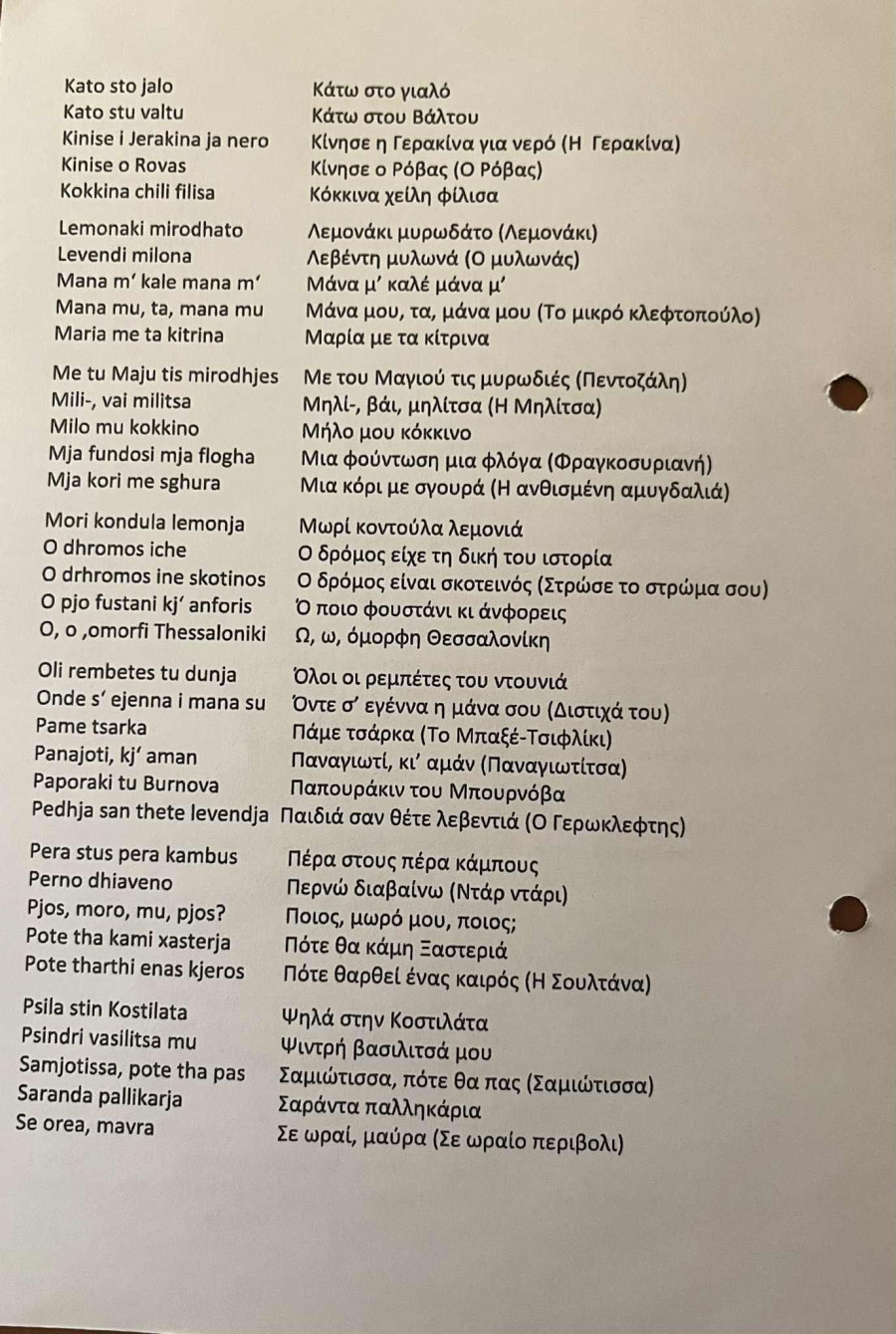 Τα ελληνικά που διάλεξαν ήταν η «Άρνηση» του Σεφέρη σε μουσική Θεοδωράκη. Είπαν και το «Ήρθε βοριάς ήρθε νοτιάς» του Χατζηδάκι πρώτα στα ελληνικά και μετά το αυθεντικό Lili Marleen, το πλέον διάσημο τραγούδι στη διάρκεια του Β’ Παγκοσμίου πολέμου που τραγουδήθηκε και από τις δύο πλευρές των αντιμαχομένων, με διαφορετικό χαρακτήρα, με αρχική ερμηνεύτρια του τραγουδιού τη Λάλε Άντερσεν. Το «Κόκκινο γαρύφαλλο», το «Τα παιδιά του Πειραιά», τη «Τζαμάικα», το «Ξημερώνει» (Το σύννεφο έφερε βροχή). Εκεί εντυπωσιάστηκα. Ενώ τραγουδούσαν όλοι μαζί ο Σπύρος Καβαλλιεράτος κάποια στιγμή σταμάτησε… «Όχι λάθος» είπε μια κυρία «έχει ακόμη μία στροφή»! Στο τέλος έκαναν και παραγγελιές… «Συννεφιασμένη Κυριακή», «Τα σπίτια είναι χαμηλά», «Ένα το χελιδόνι», «Βρέχει στη φτωχογειτονιά», «Παλικάρι», «Περιβόλι του ουρανού»… τα ζητούσαν όχι μόνο με τον τίτλο αλλά και με κάποιο στίχο.
