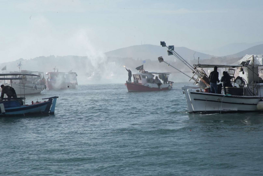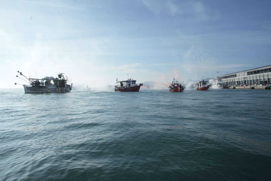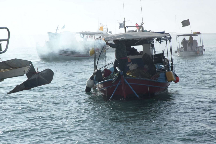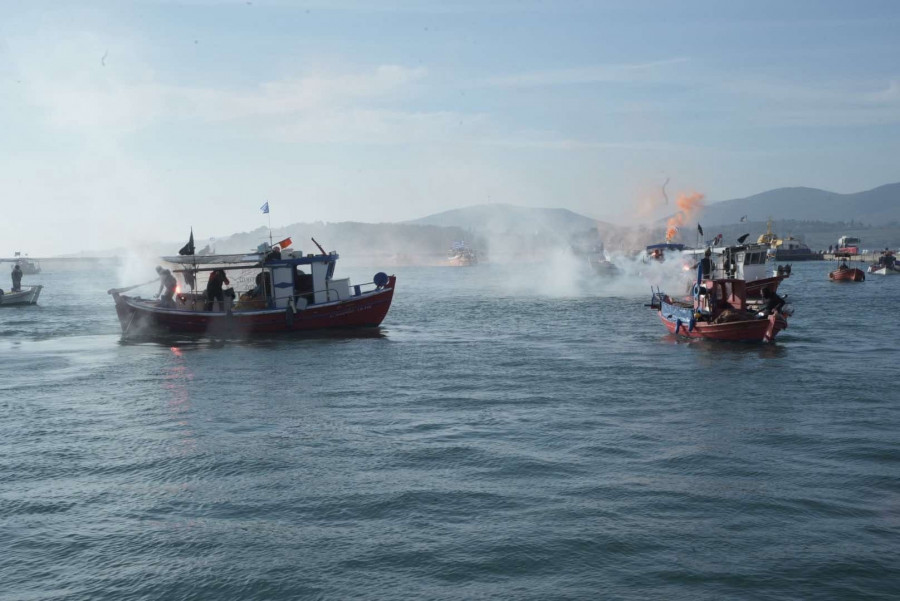 Οι αλιείς από τα καΐκια τους άναψαν καπνογόνα καθώς έφτασαν στο σημείο, ενώ οι αγρότες από τη στεριά ηχούσαν τις κόρνες των τρακτέρ τους.