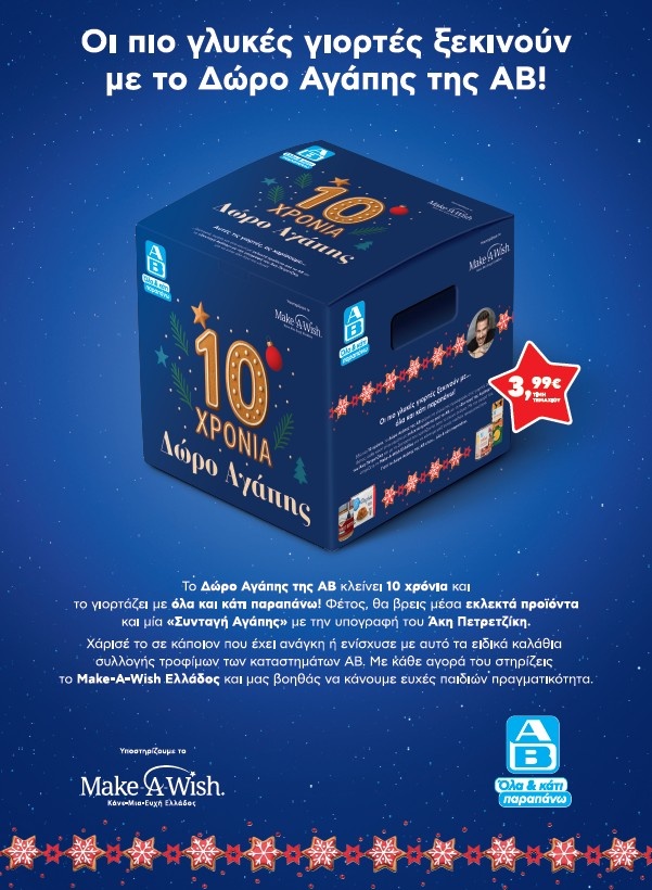 Θα μπορούσαμε να πούμε πως πρόκειται για μία χριστουγεννιάτικη παράδοση πλέον, αφού η συγκεκριμένη πρωτοβουλία είναι άρρηκτα συνδεδεμένη με το γιορτινό τραπέζι. Και αυτό γιατί η ΑΒ Βασιλόπουλος προσφέρει το «Δώρο Αγάπης» σταθερά, κάθε Χριστούγεννα, με τις φετινές γιορτές να σηματοδοτούν τη συμπλήρωση 10 χρόνων. Έτσι, αυτή τη χρονιά, στηρίζει το έργο του Make-A-Wish Ελλάδος, με μία επετειακή έκδοση.