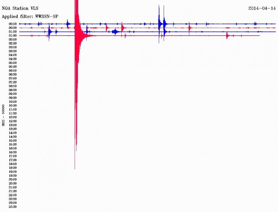 Ο σεισμός, όπως τον κατέγραψε ο σεισμογράφος του Σεισμολογικού Δικτύου του Γεωδυναμικού Ινστιτούτου του Εθνικού Αστεροσκοπείου Αθηνών, που είναι τοποθετημένος στα Βαλσαμάτα της Κεφαλονιάς.