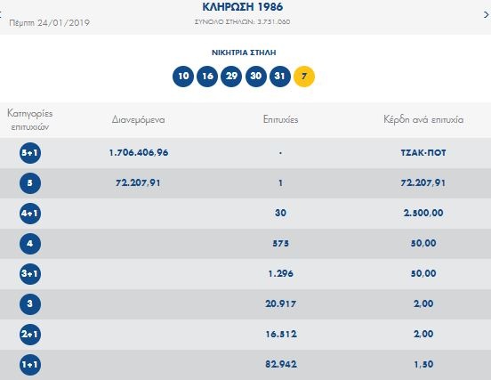 Οι τυχεροί αριθμοί που έβγαλε η αποψινή (24/01) κληρωτίδα είναι οι: 10, 16, 29, 30, 31 και Τζόκερ ο αριθμός 7.