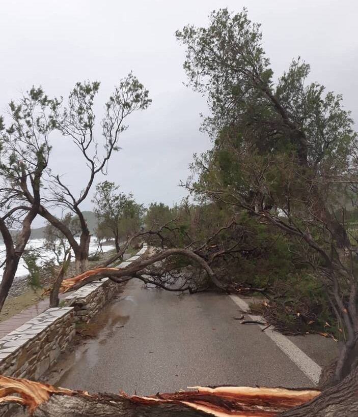 Ο άνεμος στην Τήνο ξερίζωσε δέντρα, στη περιοχή των Κιονίων με αποτέλεσμα να πέσουν μέσα στο δρόμο και να διακοπή η κυκλοφορία των οχημάτων.