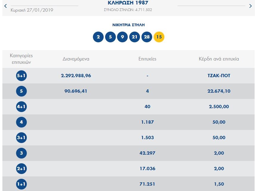 Υπενθυμίζεται ότι οι τυχεροί αριθμοί που έβγαλε η κληρωτίδα της κλήρωσης της Κυριακής (27/01) ήταν οι: 2, 5, 9, 21, 28 και Τζόκερ ο αριθμός 15.