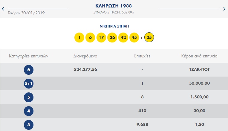 Σημειώνεται ότι στην δεύτερη κατηγορία (5+1) βρέθηκε ένα τυχερό δελτίο που κερδίζει το ποσό των 50.000 ευρώ.