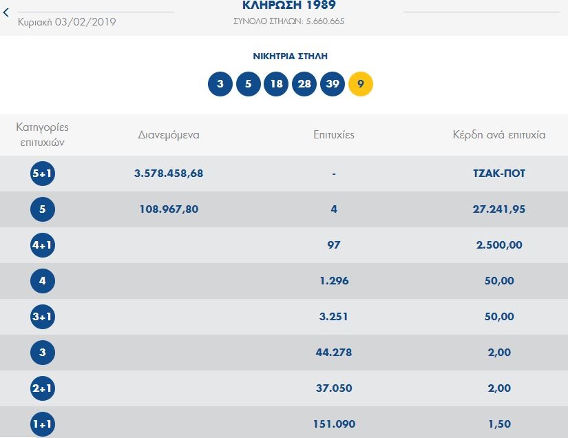 Οι τυχεροί αριθμοί που έβγαλε η κληρωτίδα της αποψινής (03/02/2019) κλήρωσης είναι οι: 3, 5, 18, 28, 39 και Τζόκερ ο αριθμός 9.