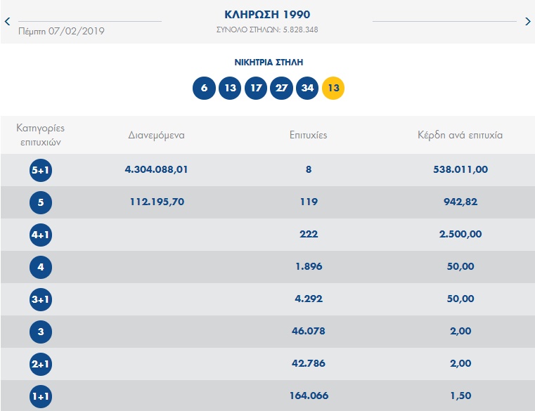 Χαρακτηριστικό είναι ότι οι τυχεροί στην κατηγορία 4+1 (222 συνολικά) με τα 2.500 ευρώ που κέρδισαν, παίρνουν περισσότερα χρήματα από αυτούς που «έπιασαν» 5άρι (119).