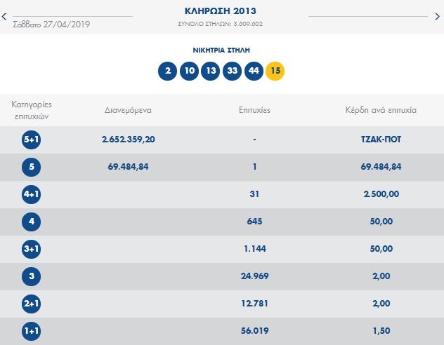 Αξίζει να σημειωθεί ότι βρέθηκε στη δεύτερη κατηγορία (5αρια) ένα επιτυχημένο δελτίο που κερδίζει 69.484,84 ευρώ!