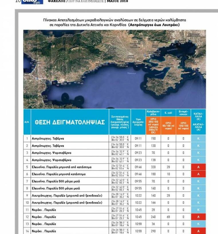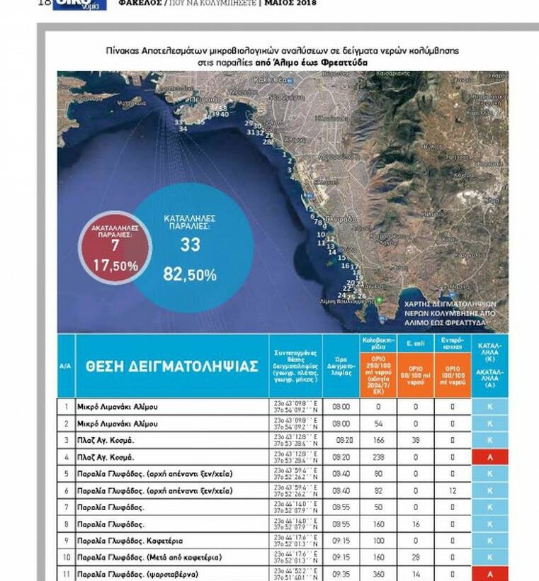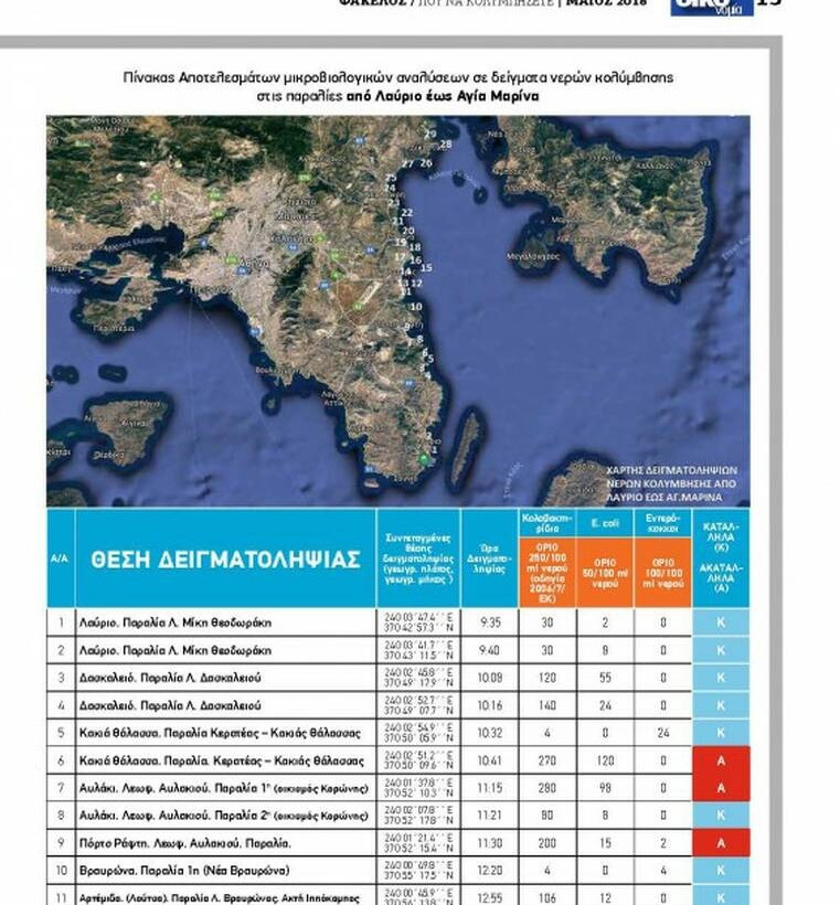 Την περασμένη χρονιά το Κέντρο Οικολογικών Ερευνών, είχε πραγματοποιήσει εξονυχιστική έρευνα για τις παραλίες και τους χώρους κολύμβησης της Αττικής δημιουργώντας μια λίστα με τις καθαρές αλλά και τις ακατάλληλες ακτές.