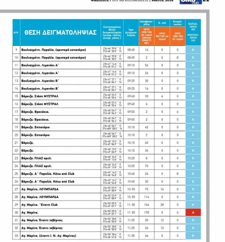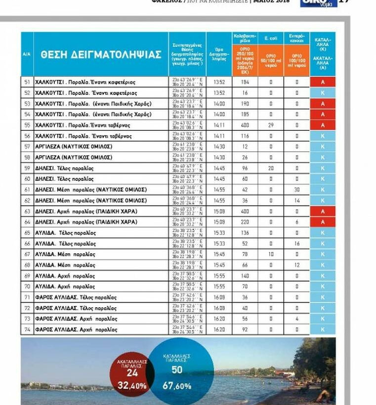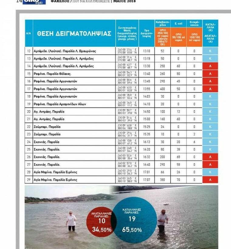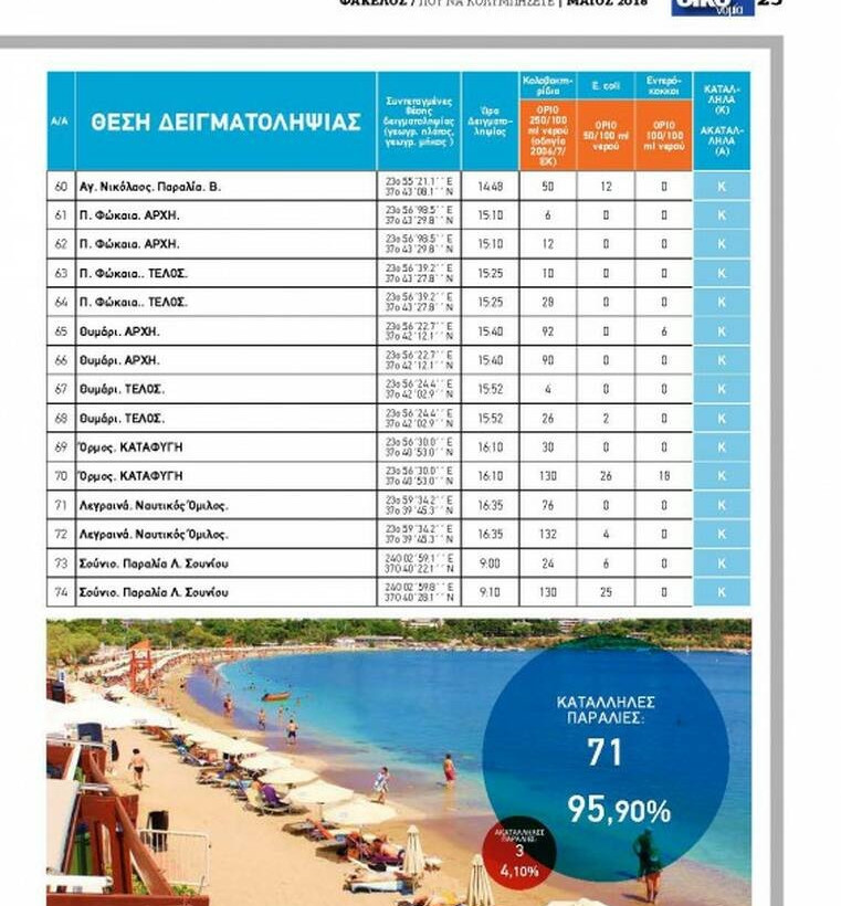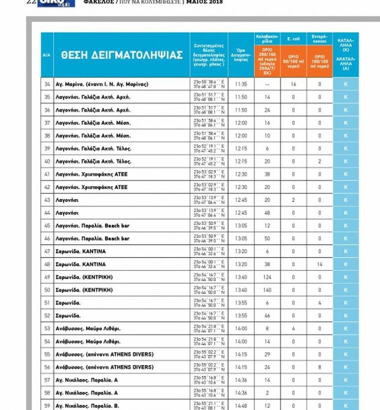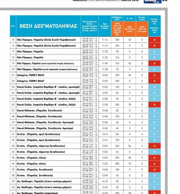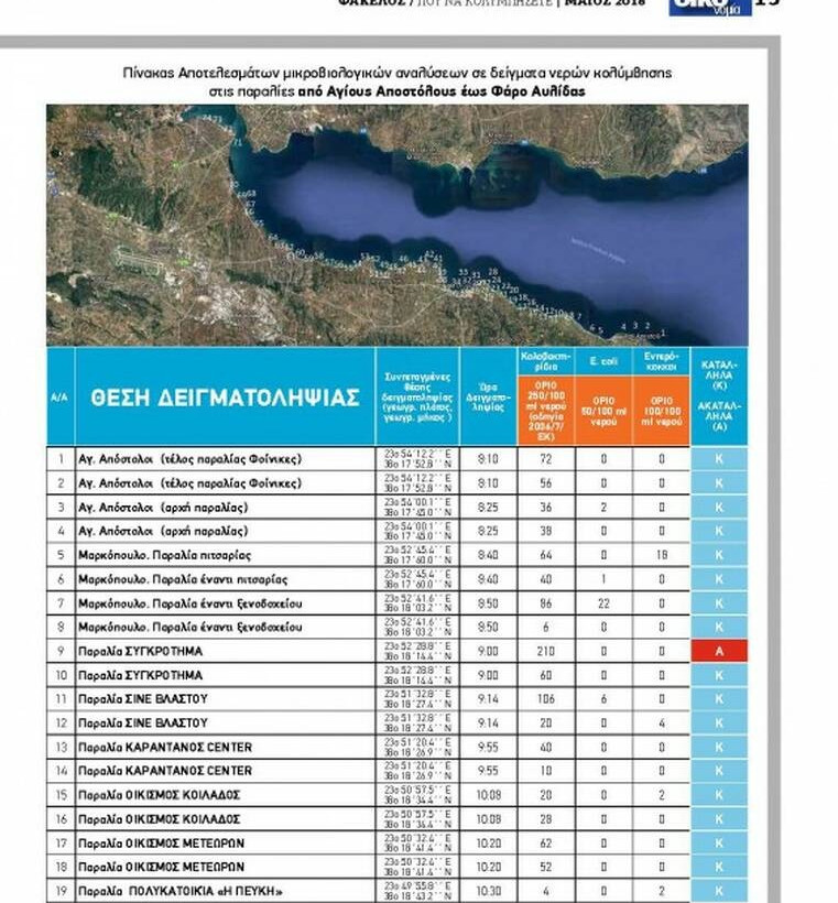 Με γνώμονα τα αποτελέσματα αυτών των μετρήσεων, έκανε μια κατανομή στις παραλίες χαρακτηρίζοντάς τες Κατάλληλες (Κ) για κολύμβηση και Ακατάλληλες (Α).