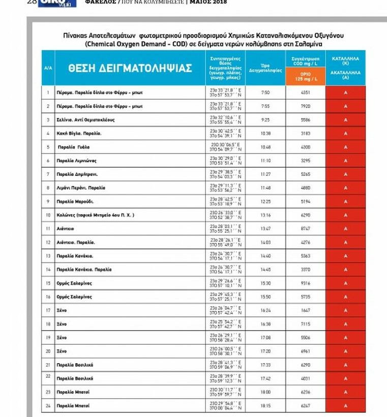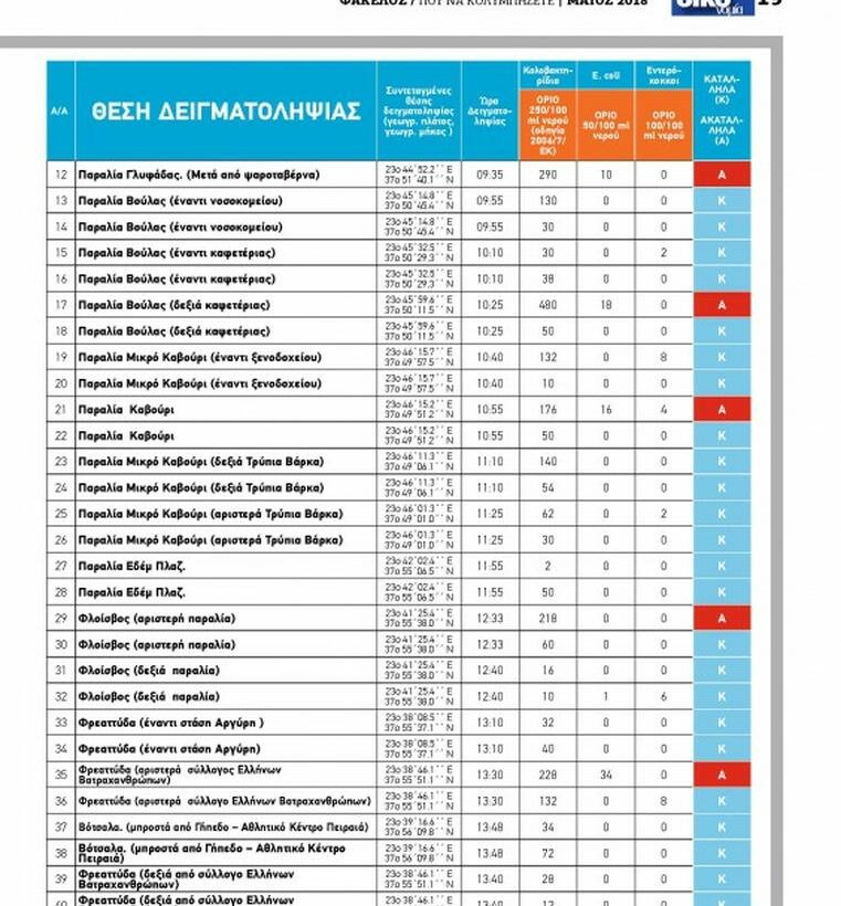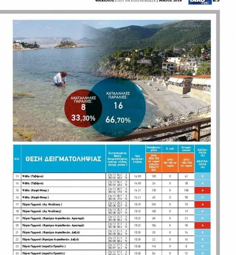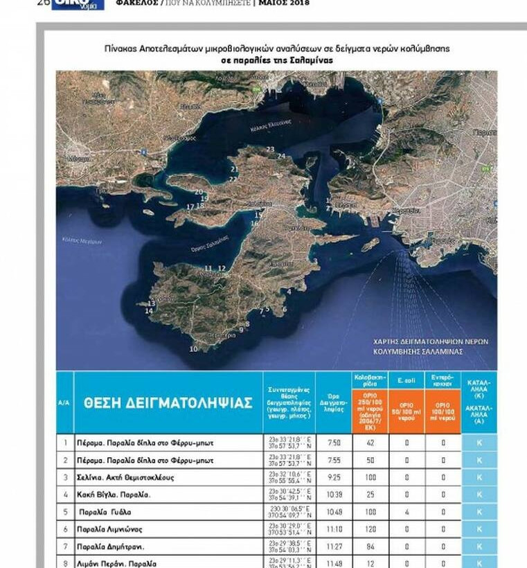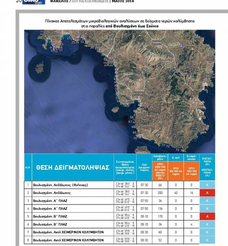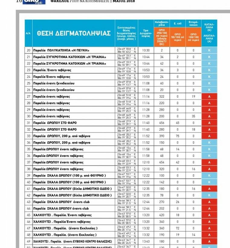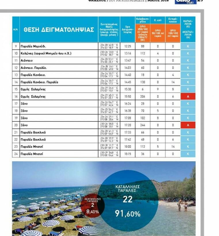 Με γνώμονα τα αποτελέσματα αυτών των μετρήσεων, έκανε μια κατανομή στις παραλίες χαρακτηρίζοντάς τες Κατάλληλες (Κ) για κολύμβηση και Ακατάλληλες (Α).