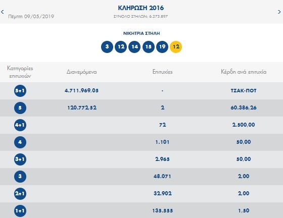 Υπενθυμίζεται ότι οι τυχεροί αριθμοί που είχε βγάλει η κληρωτίδα (2016) την περασμένη Πέμπτη ήταν οι: 3, 12, 14, 15, 19 και Τζόκερ ο αριθμός 12.
