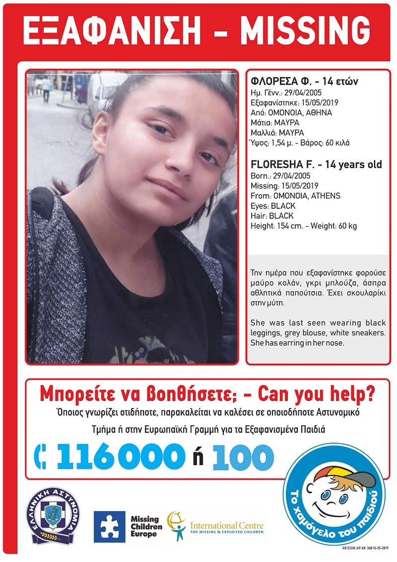 Σύμφωνα με την ανακοίνωση από το Χαμόγελο του Παιδιού, πρόκειται για την 14χρονη Φλορέσα Φ., η οποία εξαφανίστηκε στις 18:00 το απόγεμα της Τετάρτης (15/5) από την περιοχή της Ομόνοιας στην Αθήνα.
