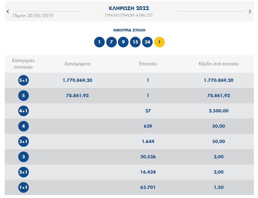 Τζόκερ: Πραγματοποιήθηκε την Πέμπτη 30 Μαΐου 2019 η κλήρωση του Τζόκερ [αριθμός κλήρωσης 2022] με έναν νικητή στην πρώτη κατηγορία.