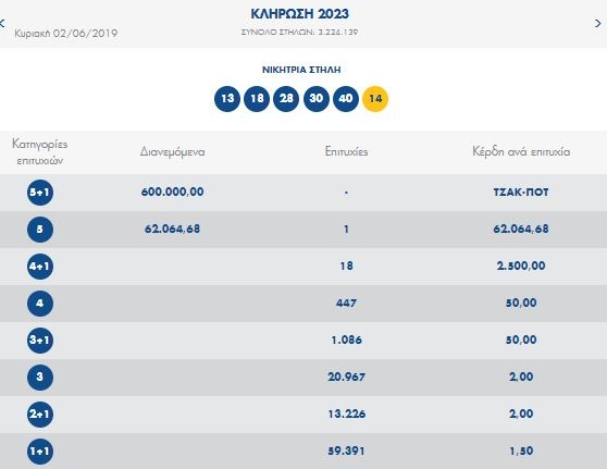 Οι τυχεροί αριθμοί που έβγαλε η κληρωτίδα είναι οι: 13, 18, 28, 30, 40 και Τζόκερ ο αριθμός 14.