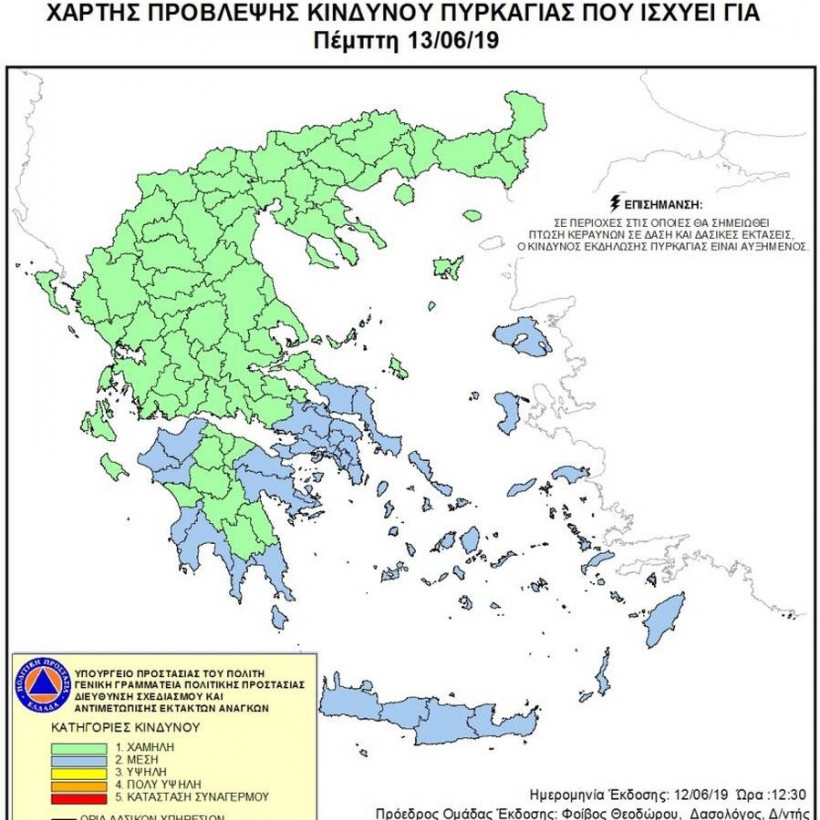 Σύμφωνα με το Χάρτη Πρόβλεψης Κινδύνου Πυρκαγιάς που εκδίδει η Γενική Γραμματεία Πολιτικής Προστασίας του Υπουργείου Εσωτερικών και Διοικητικής Ανασυγκρότησης, για σήμερα Πέμπτη, 13 Ιουνίου, προβλέπεται μέσος κίνδυνος πυρκαγιάς (κατηγορία κινδύνου 2), σε ορισμένες περιοχές.