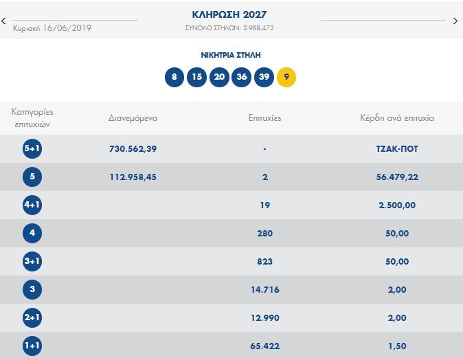 Υπενθυμίζεται ότι τυχεροί αριθμοί που έβγαλε η κληρωτίδα της χθεσινοβραδινής κλήρωσης ήταν οι: 8, 15, 20, 36, 39 και Τζόκερ ο αριθμός 9.