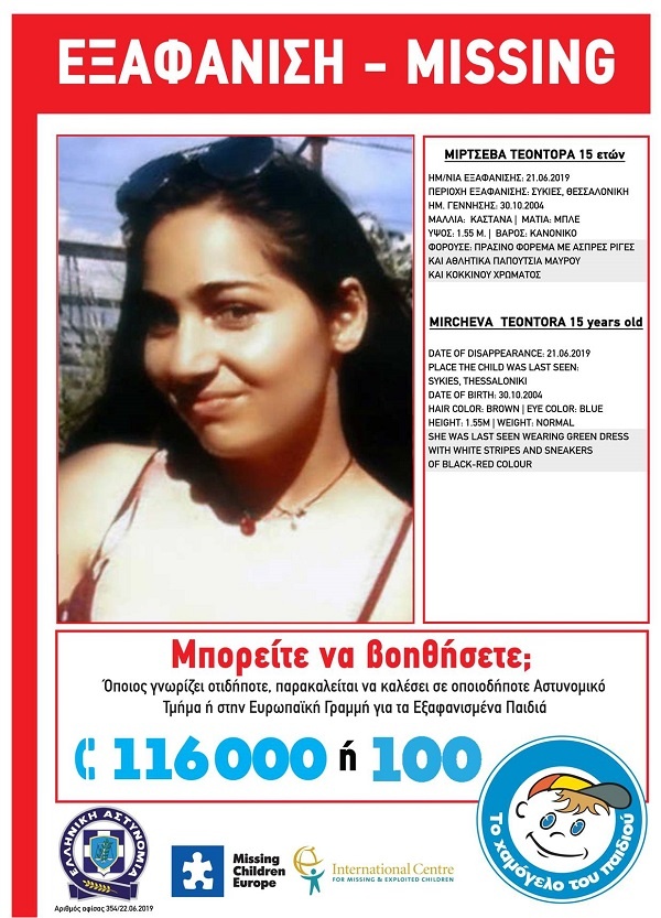 Την εξαφάνιση της 15χρονης Τεοντόρα Μίρτσεβα, από τις Συκιές, στη Θεσσαλονίκη, ανακοίνωσε το Χαμόγελο του Παιδιού.