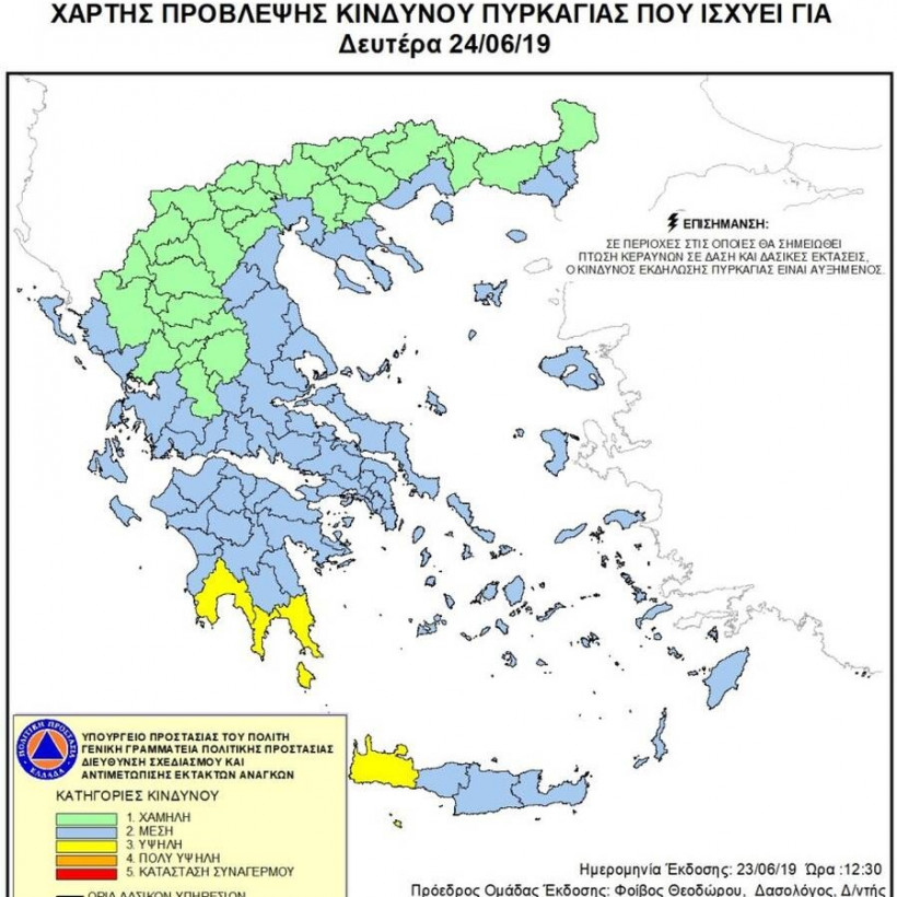 Σύμφωνα με το Χάρτη Πρόβλεψης Κινδύνου Πυρκαγιάς που εκδίδει η Γενική Γραμματεία Πολιτικής Προστασίας του Υπουργείου Εσωτερικών και Διοικητικής Ανασυγκρότησης, για σήμερα Δευτέρα, 24 Ιουνίου, προβλέπεται υψηλός κίνδυνος πυρκαγιάς (κατηγορία κινδύνου 3), σε ορισμένες περιοχές.